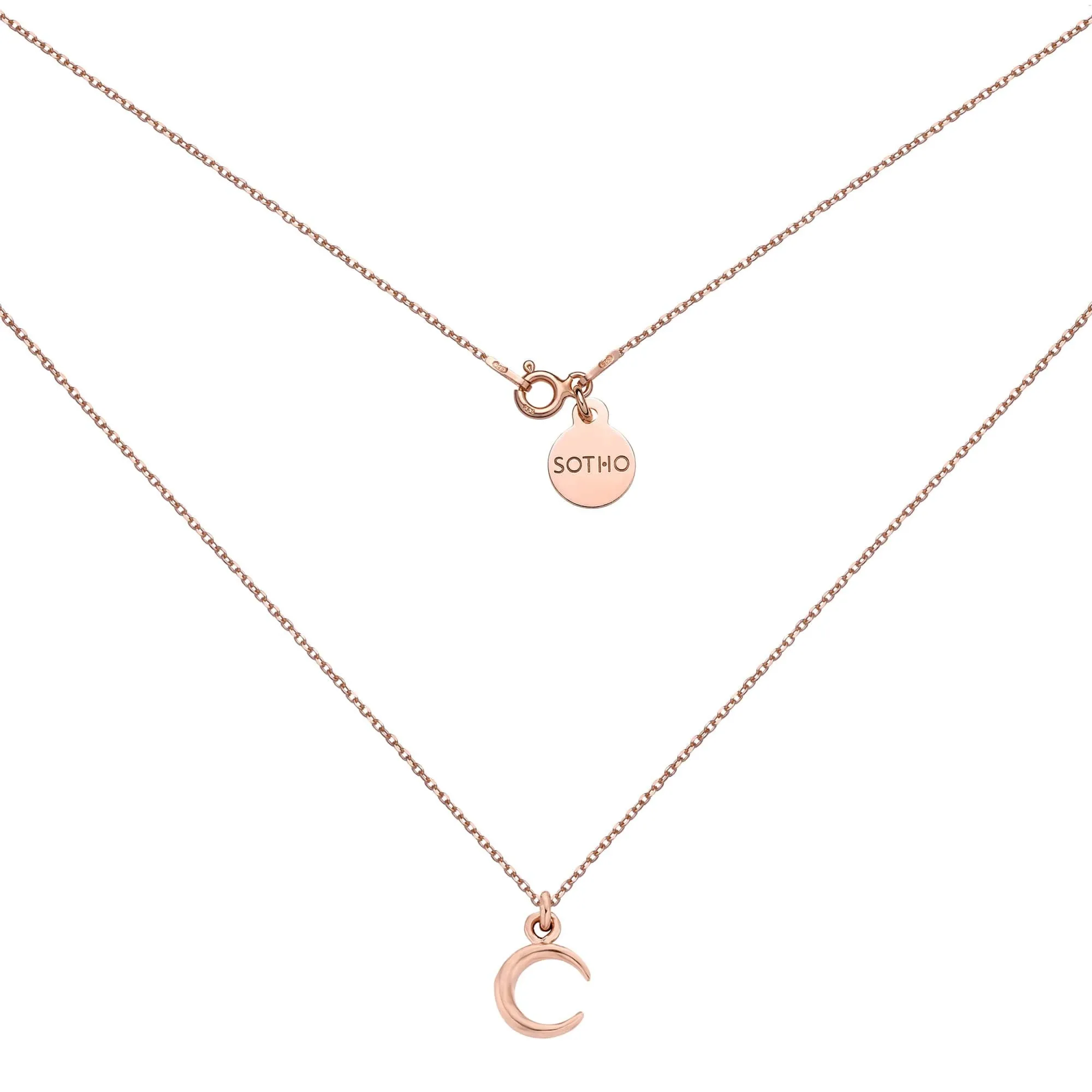 Złoty naszyjnik łańcuszkowy zdobiony księżycem i zawieszką z logo marki. Całość wykonana ze srebra 925 powlekanego 24 karatowym różowym złotem. Długość naszyjnika do wyboru 38, 40, 45, 50, 60 lub 70cm Grubość łańcuszka 1 mm Księżyc 12,7 x 10,1 mm Zawieszka z logo 10 mm Produkt o wadze poniżej 5 g. Zapakowany w eleganckie pudełeczko z logo marki. Posiada logowaną metkę. Istnieje możliwość zamówienia naszyjnika innej długości, z innym modelem zawieszki, z kilkoma zawieszkami, na innym modelu łańcuszka, w wersji ze srebra 925 lub srebra 925 powlekanego 24 karatowym żółtym złotem, z dodatkowymi kamieniami, perłami lub kryształami SWAROVSKI® CRYSTAL itp.