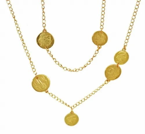 Naszyjnik z ciekawą etniczna zawieszką. Stal szlachetna pozłacana. Gwarancja pozłocenia i jakości. Warstwa złota naniesiona w metodzie – PVD- napylanie próżniowe jonami tytanu, czy też azotkiem tytanu jest nowoczesną metodą nanoszenia powłok o bardzo dużej trwałości. * Pokryte jest w całości 4 – 8 mikronową warstwą 14K, 18K i 24K złota. * Warstwa złocenia pokryta jest lakierem jubilerskim, który zabezpiecza powłokę złota przed ścieraniem i nadaje wspaniały połysk * Biżuteria wykonana ze stali szlachetnej-należy do grupy stali o strukturze austenitycznej ( podobna chirurgiczna 316 L) : – jest hipoalergiczna i nie uczula, ponieważ nie emituje związków niklu do organizmu – nie koroduje, nie odbarwia się i długo cieszy swoim blaskiem – ścieralność uzależniona od noszenia i od pH ciała – nie wymaga specjalnej konserwacji jak biżuteria ze srebra, czy złota Ze względu na różne ustawienia monitorów oraz różną jakość wyświetlaczy zastosowanych w urządzeniach mobilnych, kolory przedstawione na zdjęciach mogą nieznacznie różnić się od rzeczywistych.
