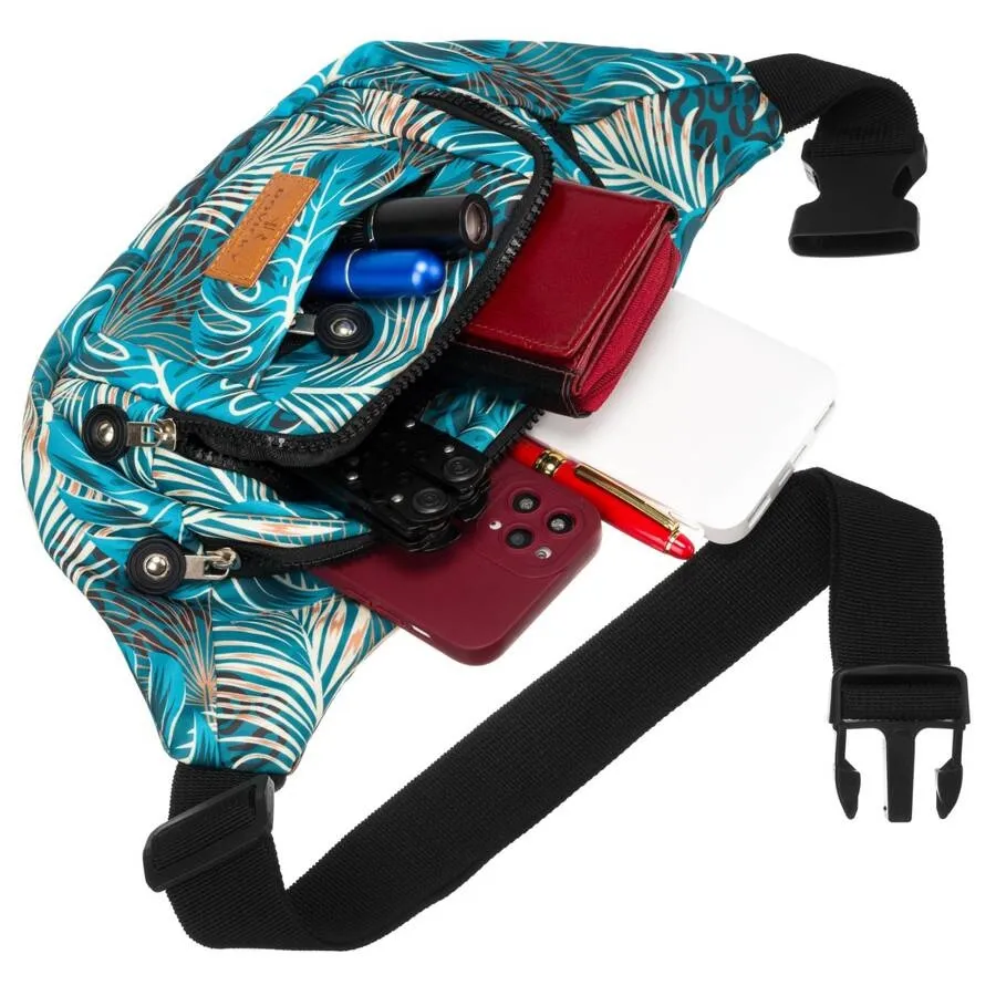 Modna saszetka damska Rovicky z wyrazistym wzorem. Pojemna nerka crossbody, idealna na ramię lub biodra. Lekka, miejska torba z kieszonkami na suwak, doskonała na telefon i codzienne drobiazgi.