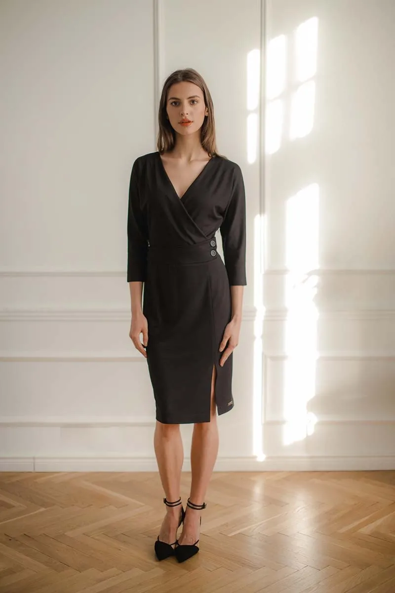 Czarna Dopasowana Sukienka z Kopertowym Dekoltem
