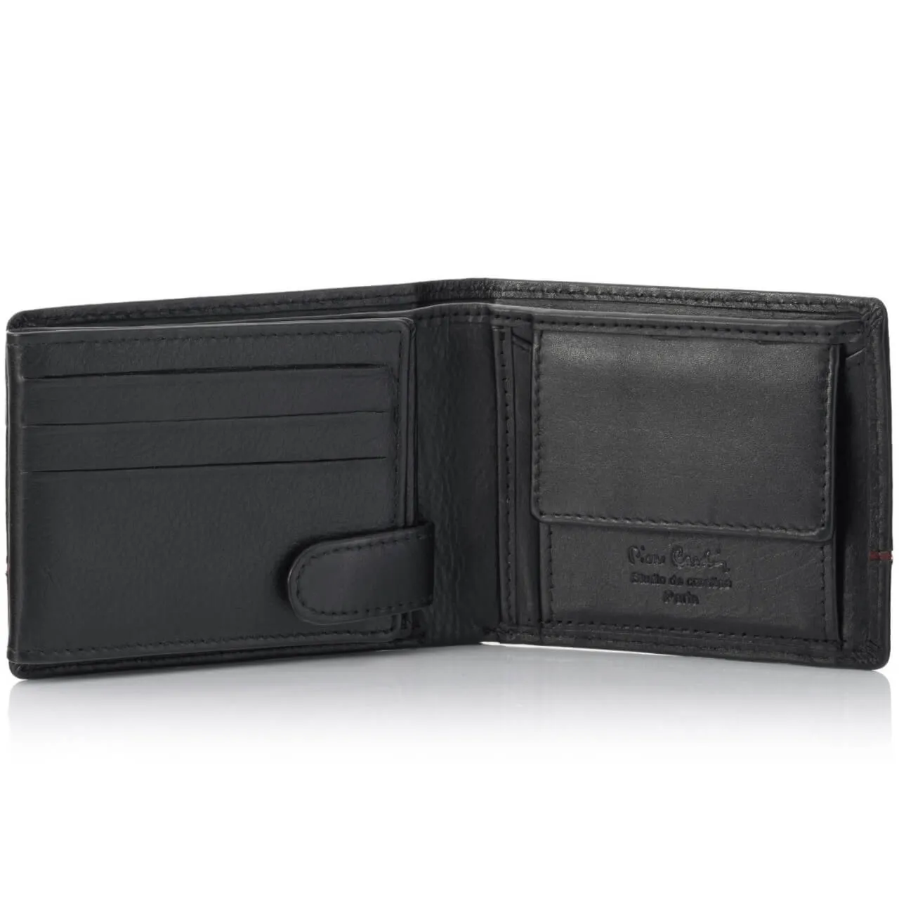 Nieduży elegancki portfel męski YS605 323 z RFID – czarnyPrezentowany portfel spodoba się wszystkim miłośników eleganckich dodatków, wykonanych z wysokiej jakości skóry naturalnej. Francuska marka Pierre Cardin od lat stanowi synonim szyku i elegancji – nie trzeba jej reklamować!Pojemny portfel o wymiarach 11 cm x 8,5 cmPrezentowany portfel został wykonany z miękkiej skóry naturalnej w klasycznym czarnym kolorze i ozdobiony na okładce paskiem w kolorze czerwonym lub czarnym. Stosunkowo niewielkie rozmiary sprawiają, że wygodnie leży w dłoni i mieści się do każdej kieszeni spodni lub marynarki. A układ zakładek i duża ilość kieszonek przekładają się na dużą pojemność i funkcjonalność tego modelu. Portfel jest orientacji poziomej, o wymiarach 11 cm x 8,5 cm i ok. 2,8 cm grubości.Portfel posiada dwie przestronne kieszenie na banknoty, zapinaną na zatrzask bilonówkę, aż 9 miejsc na karty płatnicze i 4 dodatkowe kieszenie na dokumenty, w tym dwie osiatkowane (nie mieszczą dowodu rejestracyjnego).Technologia RFID dla ochrony danychTen model portfela posiada membranę RFID, która blokuje fale radiowe i uniemożliwia odczyt z kart dotykowych.