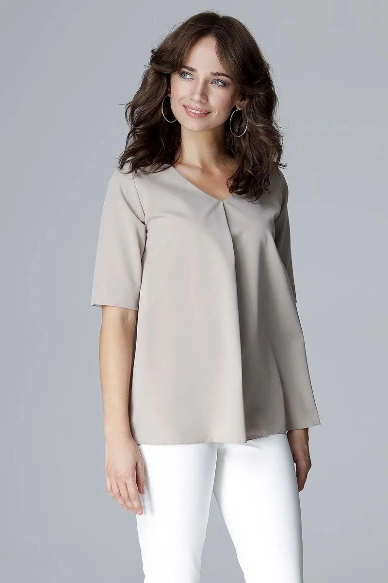 Beżowa Bluzka o Swobodnym Kroju z Zakładką