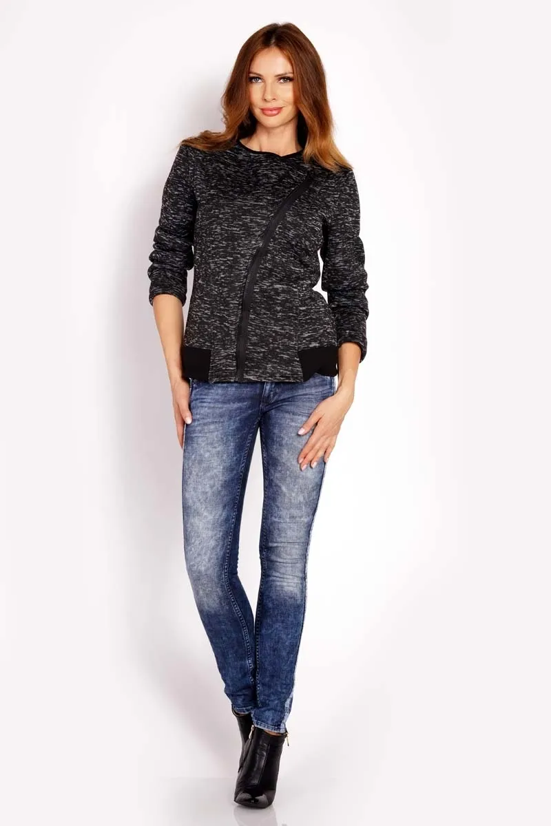 Szary niezapinany płaszcz bez kołnierza z materiału typu pianka dzianinowa. Prosty, luźny krój docenią kobiety o całkowicie różnych typach sylwetek. Urok płaszcza przejściowego tkwi w jego prostocie. Jedynymi ozdobami, które zastosowano w tym modelu są przeszycia na wysokości talii. Sprawdzi się zarówno jako okrycie do eleganckiej sukienki w zestawieniu ze szpilkami, jak i dodatek do casualowej kreacji z jeansami i wygodnymi botkami lub trampkami. Materiał: poliester 100%
