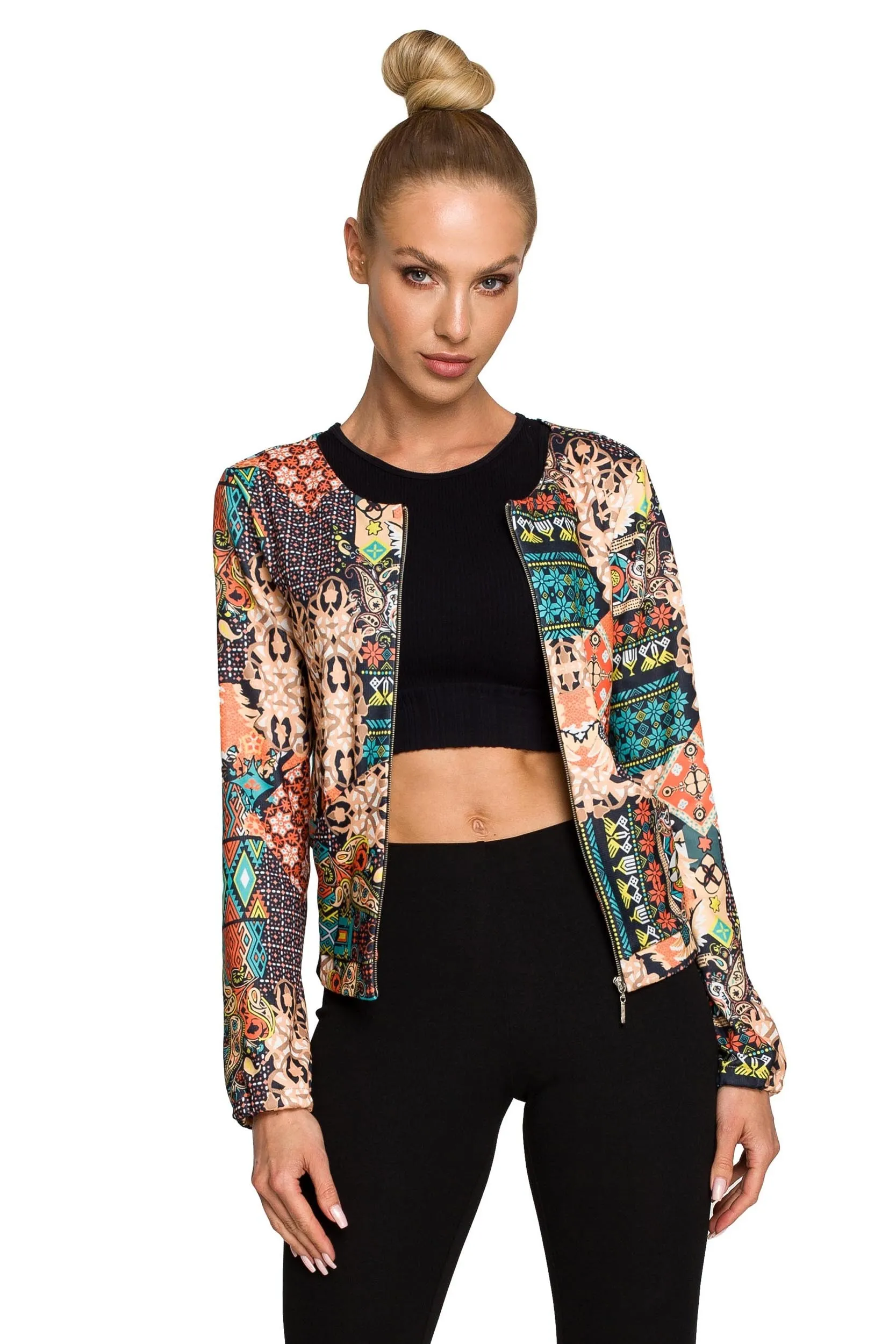 Nowoczesna kurtka z modnym printem . Zapinana na metalowy zamek. Nowocześnie połączyliśmy dzianiną bawełnianą pokrytą kolorowym printem z fasonem bluzy. Zachwyci cię ściągacz, który wszyty jest z tyłu. Tworzy idealny zestaw z czarnymi spodniami. Modelka ma 172 cm wzrostu i nosi rozmiar S 95% bawełna 5% elastan