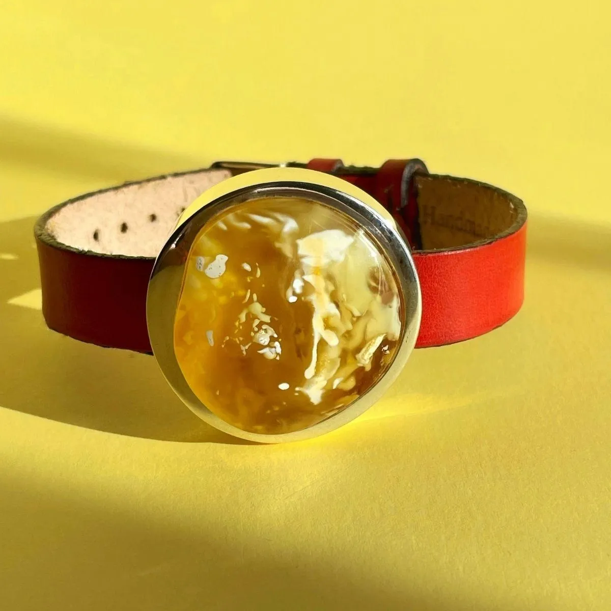 Unikatowa bransoleta srebrna na skórzanym pasku z miodowym bursztynem