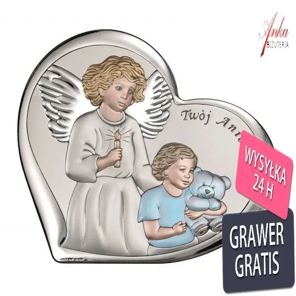 ANIOŁEK NAD DZIECIĄTKIEM – różowy „Twój Anioł stróż” Prezent dla dziewczynki KOD PRODUKTU: S.6526R/2 Wymiary: 11 cm * 9,6 cm Grawer do obrazka gratis ! Produkt wyprodukowano w całości we Włoszech przez firmę BELTRAMI z załączonym certyfikatem Obrazek wykonany z aluminium i srebra, pokryty lakierem ochronnym. Posiada możliwość zawieszenia na ścianie , łóżeczku dziecięcym itp… Prezentowany produkt jest odporniejszy na odkształcenia mechaniczne i śniedzenie, doskonale odbija światło, co podkreśla szlachetność srebra. Obrazek zapakowany jest w eleganckie pudełko. HQ – Najwyższa jakość wykonania! Do czyszczenia wystarczy miękka ściereczka lub ciepła woda, nie zaleca się stosowania środków chemicznych, również tych przeznaczonych do czyszczenia srebra, które mogą zniszczyć wierzchnią warstwę ochronną.