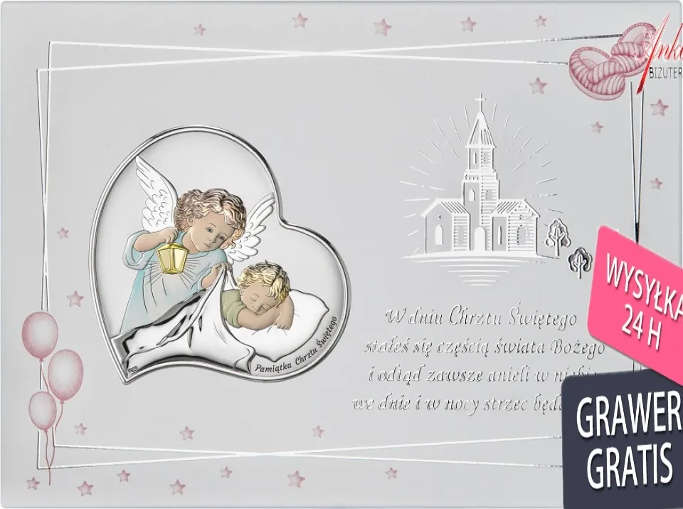 OBRAZEK SREBRNY NA BIAŁYM LAKIEROWANYM DREWNIE – ANIOŁEK Z LATARENKĄ NAD DZIECIĄTKIEM – KOLOROWY z modlitwą KOD PRODUKTU : V.DS17FCC/2C Panel z obrazkiem srebrnym przedstawiający wizerunek Aniołka z latarenką nad dzieciątkiem z napisem Pamiątka Chrztu Świętego . Wymiary: 14,5 cm * 19,5 cm Grawer do obrazka gratis ! Prześliczny obrazek wykonany z dbałością o każdy detal przez włoską firmę: DONO Obrazek wykonany jest z blachy dwuwarstwowej aluminium i srebra. Zewnętrzna warstwa srebra pokryta jest zabezpieczającym lakierem, dzięki któremu produkt zachowa swój blask. Obrazek jest odporniejszy na odkształcenia mechaniczne i śniedzenie, doskonale odbija światło, co podkreśla szlachetność srebra. Produkt można postawić lub zawiesić dzięki dołączonej do zestawu nóżce. Zewnętrzne ramki i tył obrazka wykonany z lakierowanego na biało drzewa Obrazek wysyłamy starannie zapakowany. HQ – Najwyższa jakość wykonania!