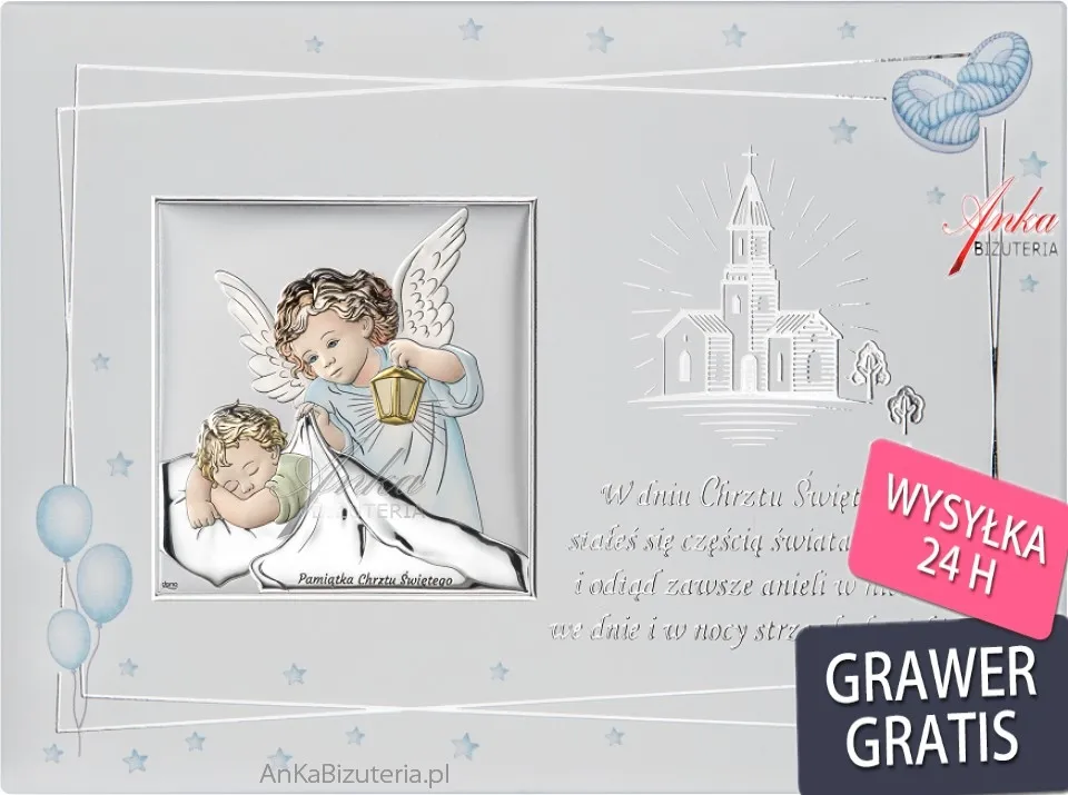 OBRAZEK SREBRNY NA BIAŁYM LAKIEROWANYM DREWNIE – ANIOŁEK Z LATARENKĄ NAD DZIECIĄTKIEM – KOLOROWY z modlitwą Prezent dla dziewczynki KOD PRODUKTU : V.DS17FCR/2C Panel z obrazkiem srebrnym przedstawiający wizerunek Aniołka z latarenką nad dzieciątkiem z napisem Pamiątka Chrztu Świętego . Wymiary: 14,5 cm * 19,5 cm Grawer do obrazka gratis ! Prześliczny obrazek wykonany z dbałością o każdy detal przez włoską firmę: DONO Obrazek wykonany jest z blachy dwuwarstwowej aluminium i srebra. Zewnętrzna warstwa srebra pokryta jest zabezpieczającym lakierem, dzięki któremu produkt zachowa swój blask. Obrazek jest odporniejszy na odkształcenia mechaniczne i śniedzenie, doskonale odbija światło, co podkreśla szlachetność srebra. Produkt można postawić lub zawiesić dzięki dołączonej do zestawu nóżce. Zewnętrzne ramki i tył obrazka wykonany z lakierowanego na biało drzewa Obrazek wysyłamy starannie zapakowany.