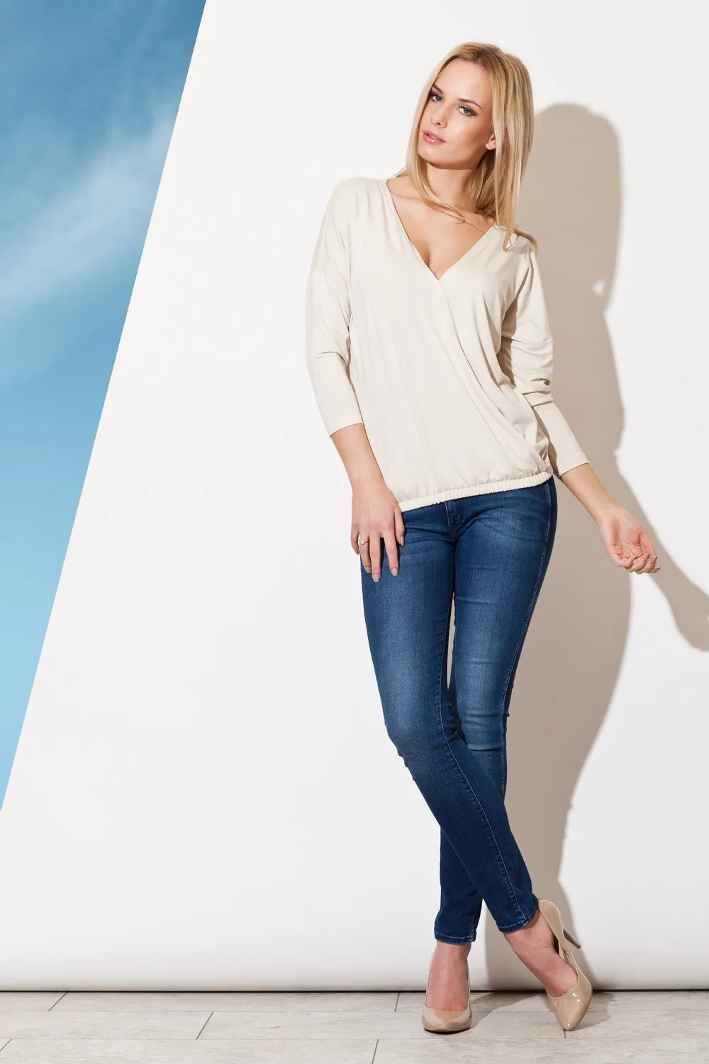 Ecru Zbluzowana Bluzka z Długim Rękawem