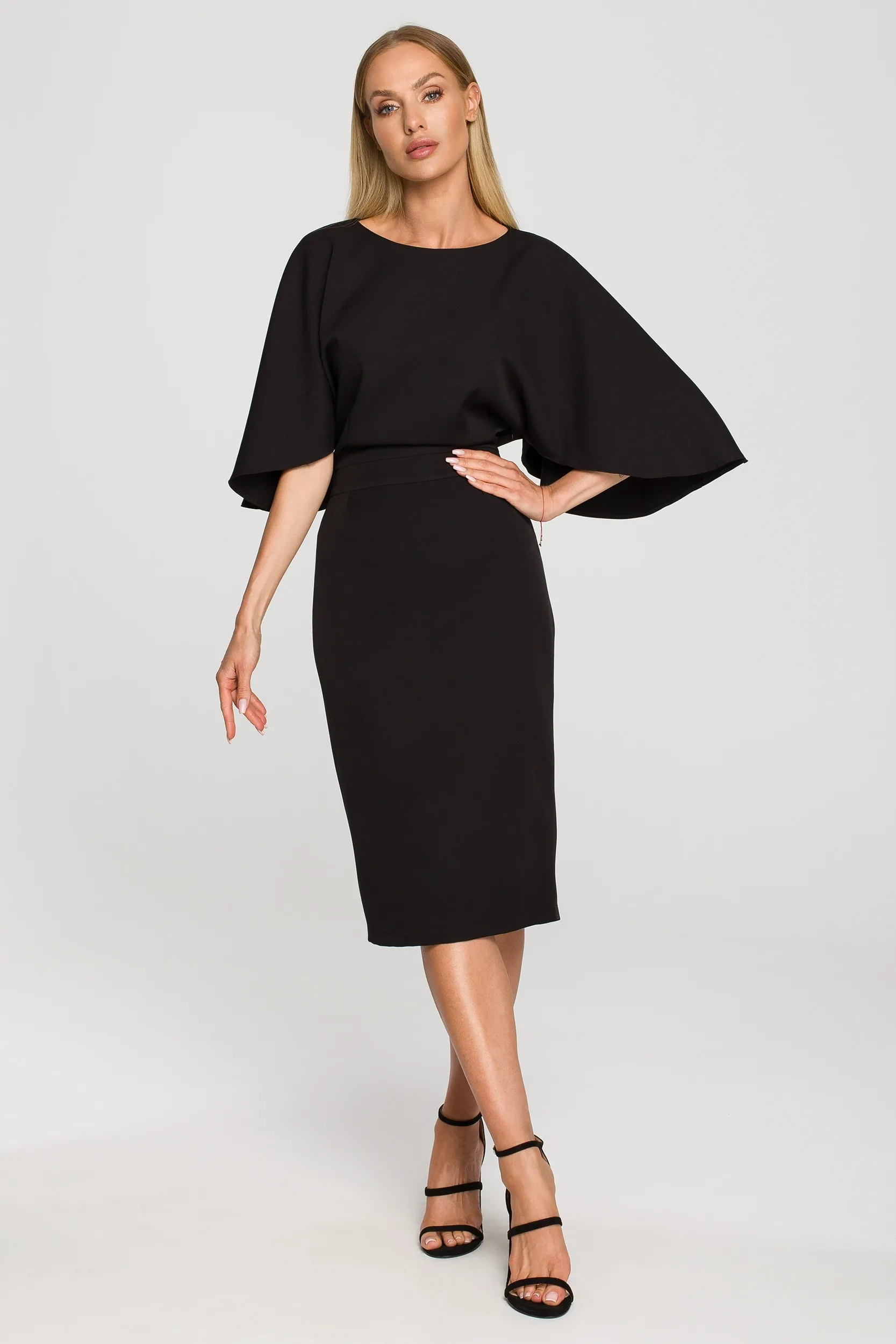Ołówkowa sukienka z szerokim rękawem do łokcia w kolorze czarnym będzie świetnym wyborem na wiele okazji. Sukienka posiada wygodny, łódkowy dekolt i szerokie rękawy,które dodają stylizacji lekkości. Idealnie podkreślona talia w tym modelu poprzez zintegrowany pas, sprawia, że każda sylwetka będzie prezentować się wspaniale. Długość za kolana jest bardzo stosowna na każdą okazję. Z tyłu rozcięcie podnoszące komfort noszenia. Dobierz do tej kreacji delikatne czółenka lub sandałki na obcasie, a stworzysz schludną i efektowną stylizację. Sukienka zarezerwowana jest dla eleganckich kobiet, które chcą czuć się w ubraniu szykownie i wygodnie! Modelka ma 172 cm wzrostu i nosi rozmiar S 95% poliester 5% elastan