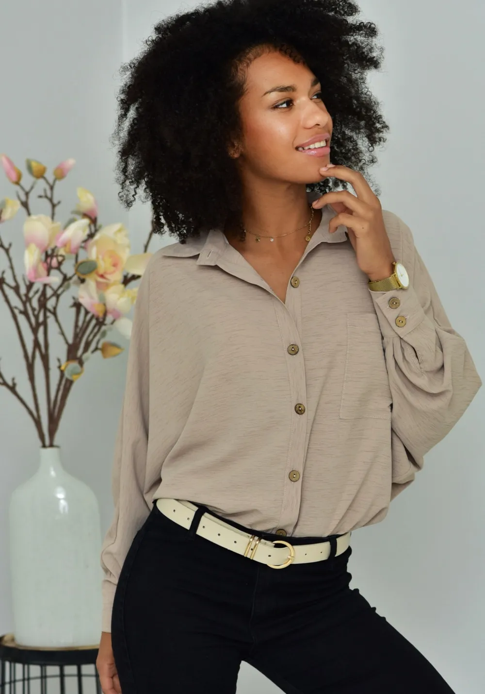 Beżowa koszula z kołnierzykiem i mankietami. Koszula oversize zapinana na guziki posłuży Ci jako baza codziennych i eleganckich stylizacji, a oprócz tego zapewni wygodę i dopasuje się do figury. Połącz uniwersalną koszulę z białym żakietem i garniturowymi spodniami, a na nogi włóż klasyczne szpilki. Skład: 95% POLIESTER , 5% ELASTAN XS S M L 1/2 BIUST oversize oversize oversize oversize 1/2 TALIA oversize oversize oversize oversize 1/2 BIODRA 55 57 59 61 RAMIĘ+RĘKAW 68 69,5 71 71 DŁUGOŚĆ 64 65,5 67 68,5