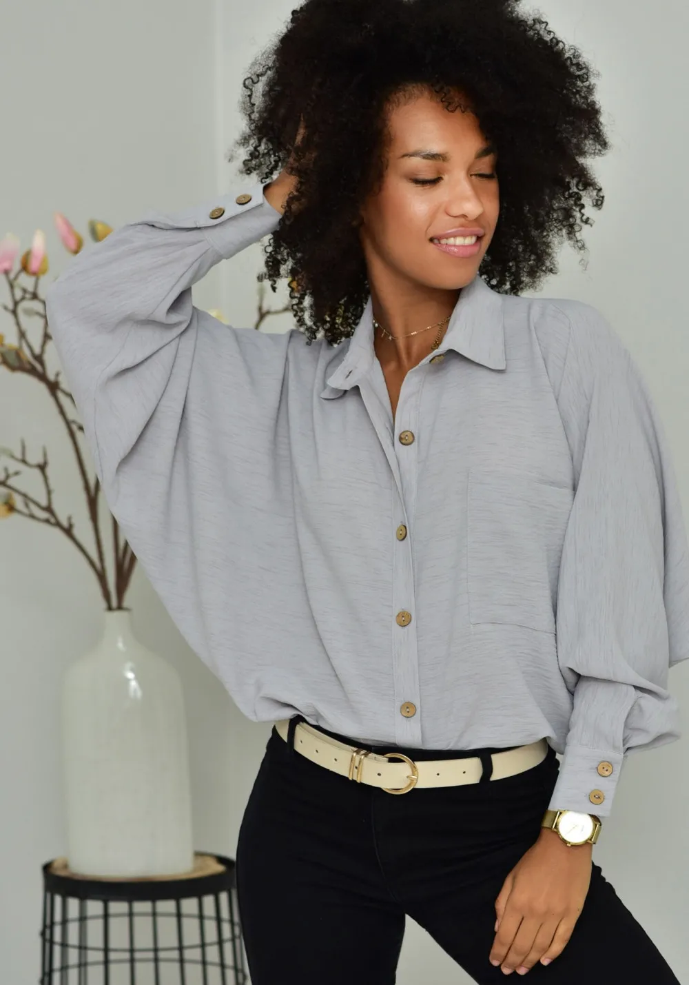 Koszula oversize w kolorze jasnoszarym. Zapinana na guziki koszula ma jedną kieszonkę na piersi, co tworzy efekt asymetryczności. Możesz zapiąć ją pod szyję lub zostawić jeden czy dwa guziczki odpięte, co doda Ci nonszalancji. Dobierz koszulę do ulubionych jeansów lub eleganckiej, ołówkowej spódnicy. Skład: 95% POLIESTER , 5% ELASTAN XS S M L 1/2 BIUST oversize oversize oversize oversize 1/2 TALIA oversize oversize oversize oversize 1/2 BIODRA 55 57 59 61 RAMIĘ+RĘKAW 68 69,5 71 71 DŁUGOŚĆ 64 65,5 67 68,5
