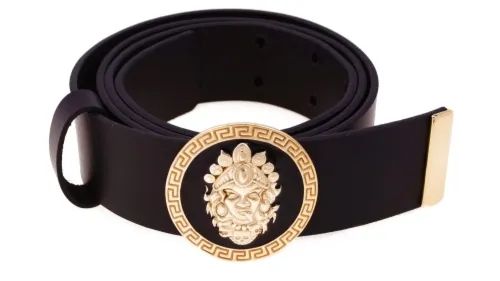 Najnowsza kolekcja! Skórzany pasek z ręcznie tworzoną i emaliowaną, okrągłą klamrą pozłacaną. Motyw hinduskiej bogini Kali. Długość 105cm, szerokość 3,3cm, klamra średnica 4,7cm.