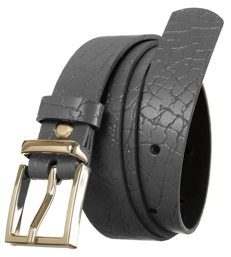 Niebanalny pasek damski wykonany z wysokiej klasy bydlęcej skóry naturalnej i solidnych metalowych elementów. Posiada złotą metalową klamerkę w prostokątnym kształcie. Na skórze tłoczenia imitujące skórę węża. Możliwość samodzielnego skrócenia paska.