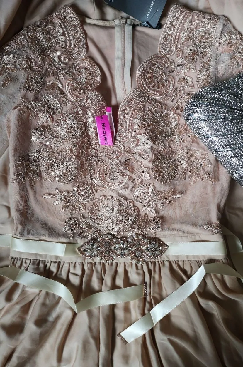 Wieczorowy pasek satynowy z sztucznymi perełkami i kryształkami 874 szampański