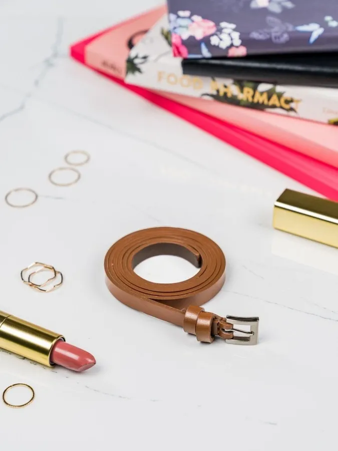 Cienki, subtelny pasek ze skóry ekologicznej o delikatnej, żyłkowanej fakturze. Zapinany elegancką, srebrną, metalową klamrą. Pasek idealny dla obwodu mierzącego 105 cm.