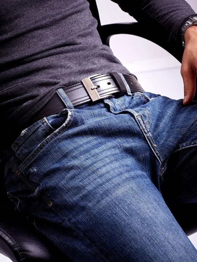 Uniwersalny pasek męski z wysokogatunkowej skóry naturalnej o półmatowym wykończeniu. Pasek zdobiony minimalistycznymi, geometrycznymi tłoczeniami wzdłuż krawędzi. Pasek zapinany standardową, metalową klamrą w srebrnym kolorze.