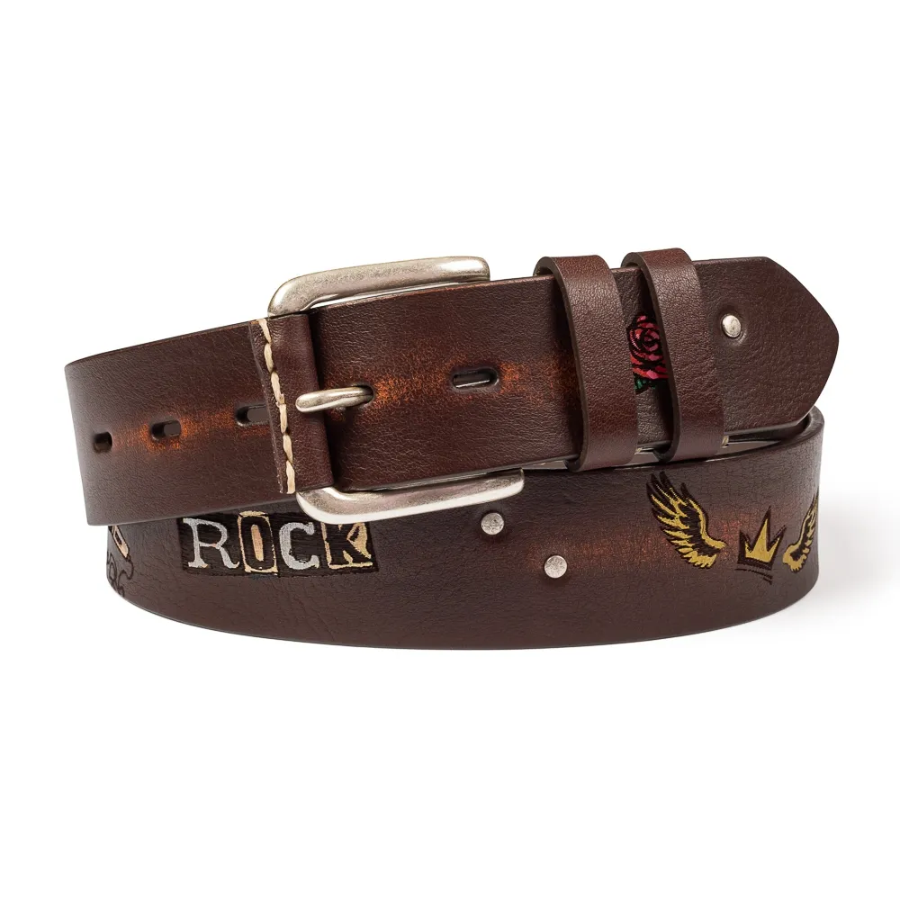 Pasek męski skórzany z wzorem Rock Tattoo brązowy 95