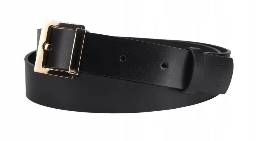 Wąski pasek zakończony masywną, zaokrągloną klamrą w złotym kolorze. Akcesorium wykonane z wysokojakościowej skóry naturalnej. Zakończone metalowym okuciem. Do regulacji sprzączka z siedmioma otworami kaletniczymi. Pasek zapakowany w markowe pudełko.