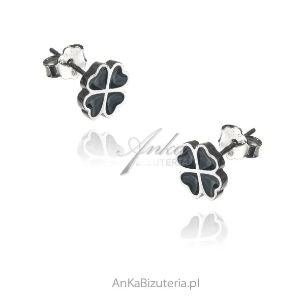Kolczyki srebrne koniczynki z czarną emalią