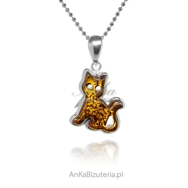 Srebrna zawieszka kotek - mruczek z koniakowym bursztynem