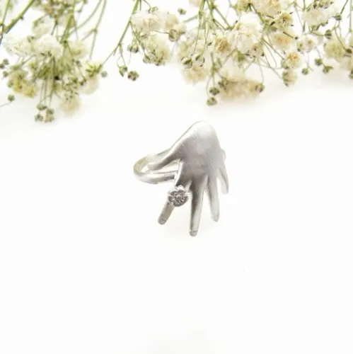 Pierścionek srebrny - Czuła dłoń z kwiatuszkiem