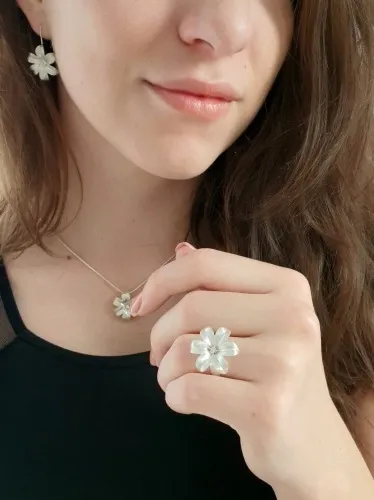Delikatny pierścionek w kształcie niezamkniętej szyny, na końcu której umieszczona został lilia. Pierścionek wykonany misternie w srebrze, następnie zoksydowany i wypolerowany. W środku kwiatuszka pręcik został zrobiony z mosiądzu. Waga pierścionka: 3,4 gr.Pierścionek jest regulowany: 13-17 rozmiar. Pełen uroku zachwyca swą oryginalnością i starannym wykonaniem. Nr katalogowy :KW10PC