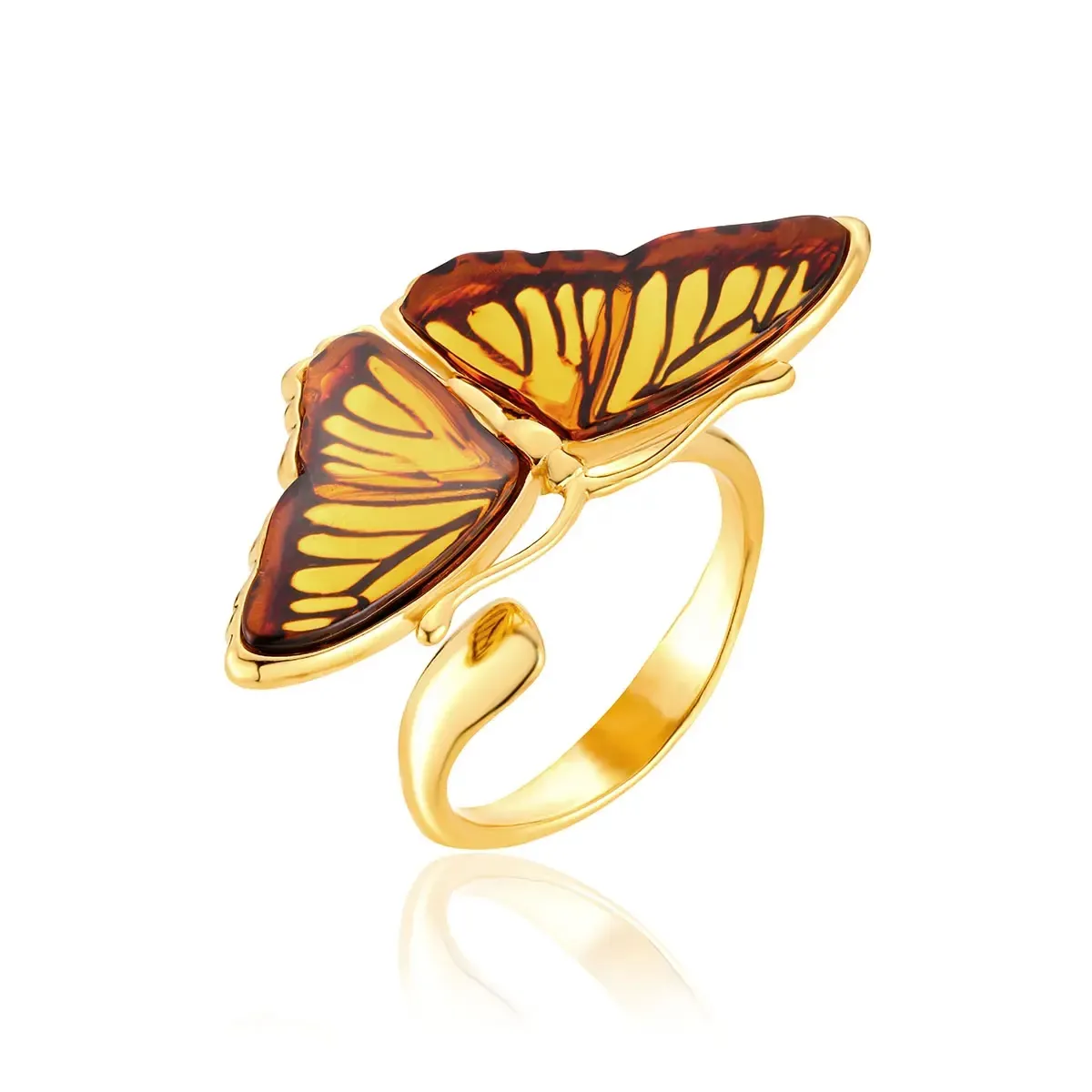 Pierścionek srebrny pozłacany motyl peleides z bursztynem