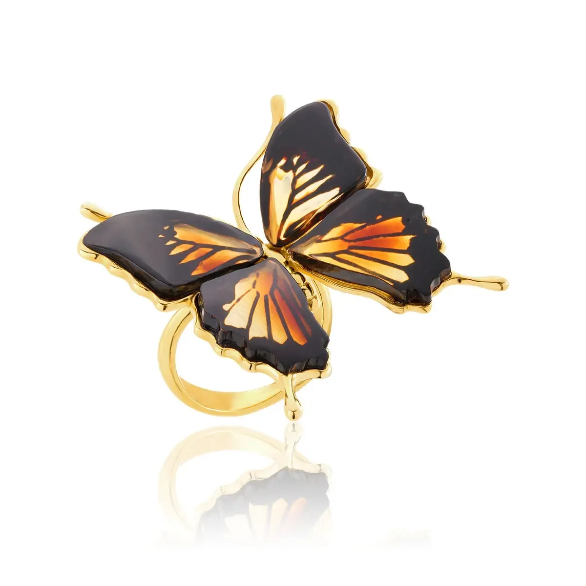 Pierścionek srebrny pozłacany motyl z bursztynem big Butterfly Touch
