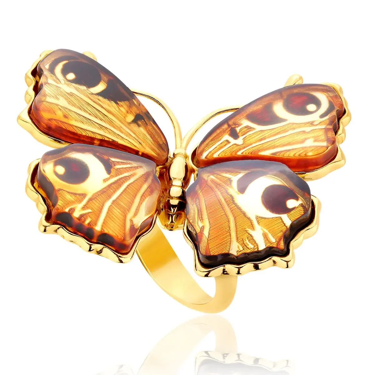 Pierścionek srebrny pozłacany motyl z bursztynem Big Butterfly Love