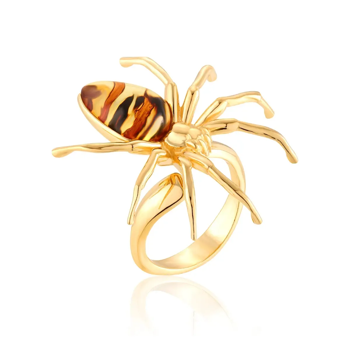 Pierścionek srebrny pozłacany pająk z bursztynem