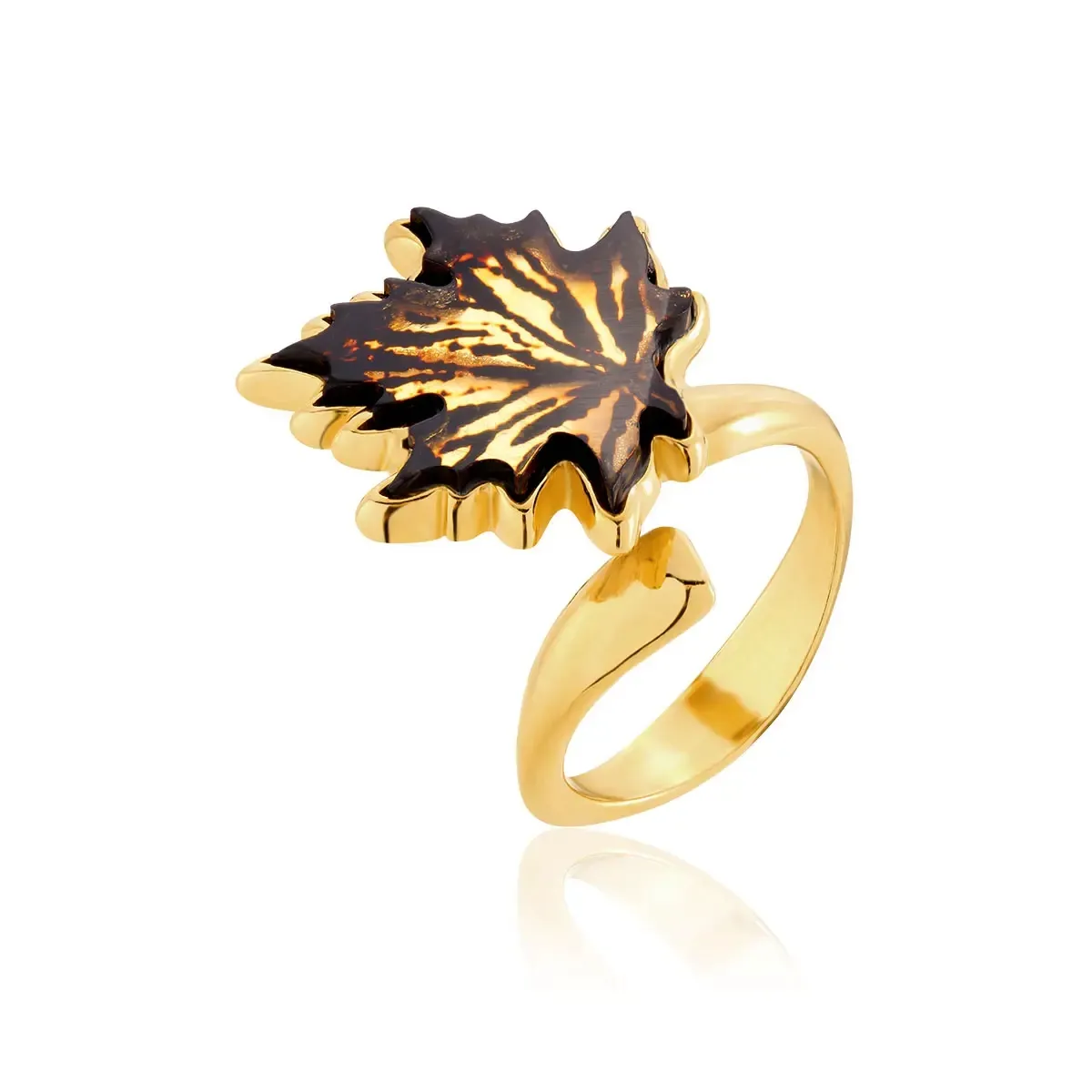 Pierścionek srebrny pozłacany liść klonu z bursztynem Maple Leaf