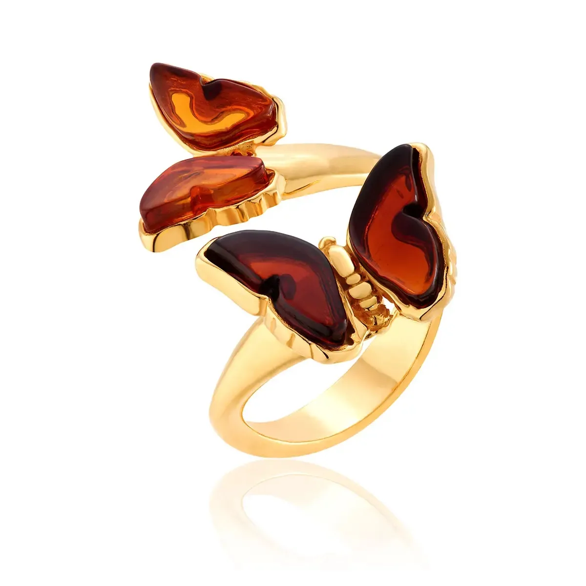 Pierścionek srebrny pozłacany z bursztynem motyl - wiśnia z koniakiem