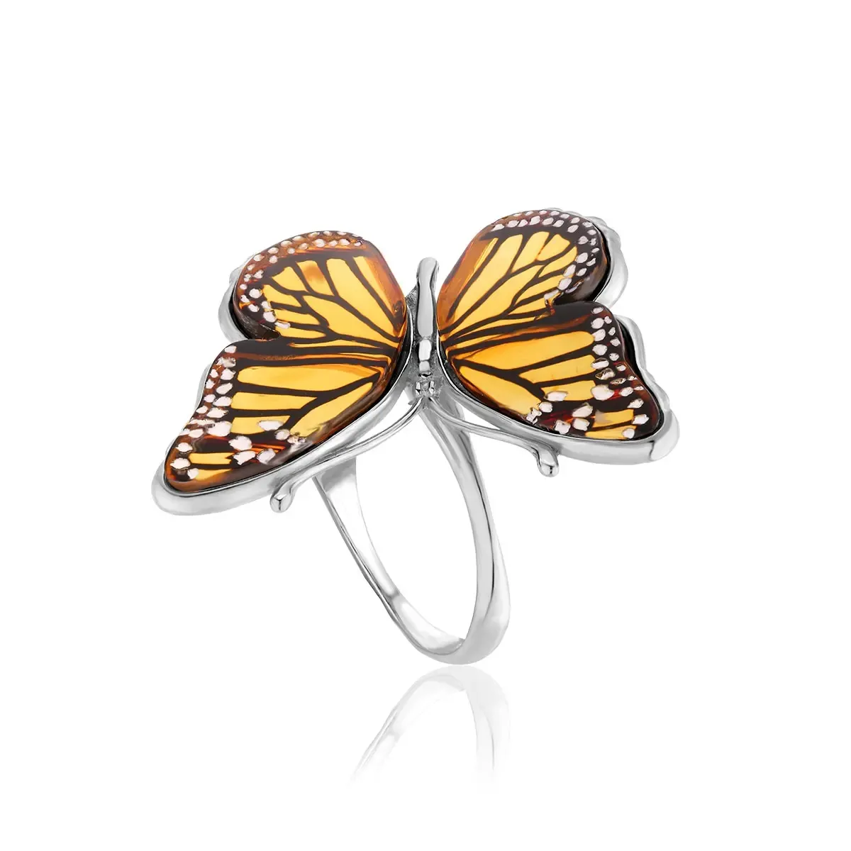 Pierścionek srebrny motyl z bursztynem bałtyckim Butterfly Monarch