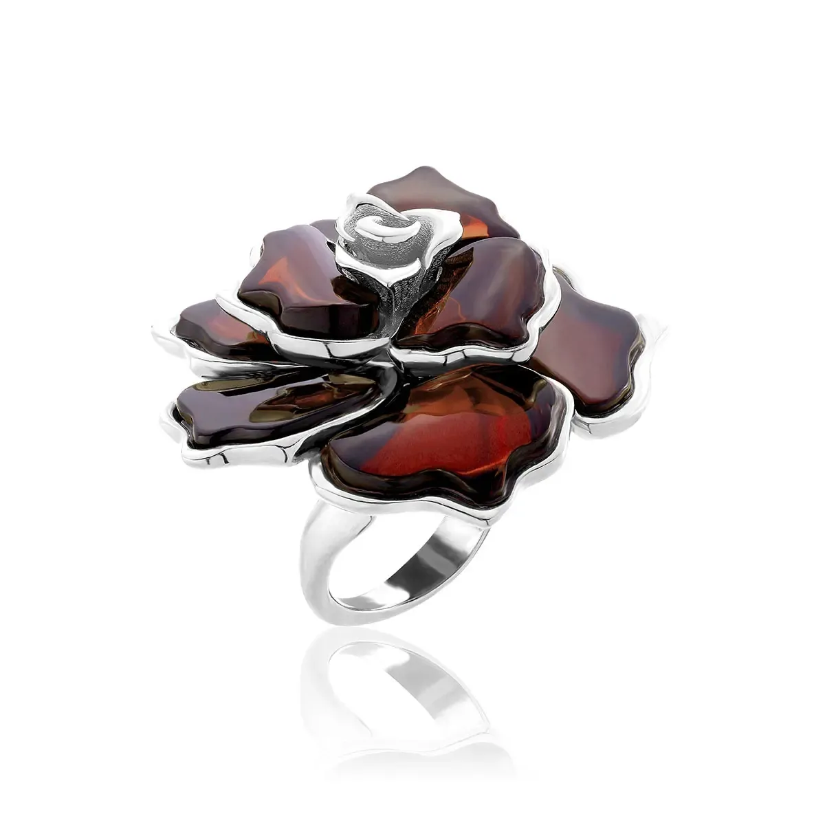 Pierścionek srebrny róża z wiśniowym bursztynem Rosebud