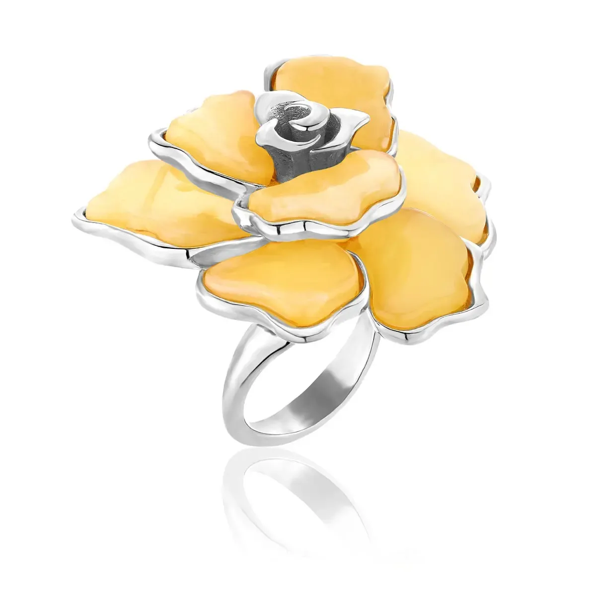 Pierścionek srebrny róża z mlecznym bursztynem Rosebud