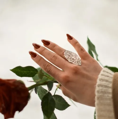Pierścionek Srebrny z Szarym Listkiem L7 Przedstawiamy oryginalny pierścionek srebrny, który łączy subtelność natury z elegancją nowoczesnego designu. Pierścionek ten, wykonany ze srebra próby 925, posiada unikalny kształt podłużnego listka. Delikatnie osadzony na regulowanej obrączce, pierścionek emanuje naturalnym urokiem i subtelną finezją. Cechy: Materiał: Srebro próby 925 Kształt: Podłużny listek Wykończenie: Oksyda grafitowa Długość listka: 4,4 cm Szerokość listka: 1,9 cm Waga pierścionka: 4,9 g Konstrukcja: Regulowana obrączka Pierścionek z szarym listkiem L7 to nie tylko biżuteria, ale także symbol połączenia z naturą. Jego minimalistyczny design, z subtelnym listkiem wykończonym grafitową oksydą, przywołuje na myśl piękno liścia unoszącego się na wietrze. Delikatne, ale wyraziste, ten pierścionek jest idealnym dodatkiem, który podkreśla naturalne piękno i elegancję swojej nosicielki.