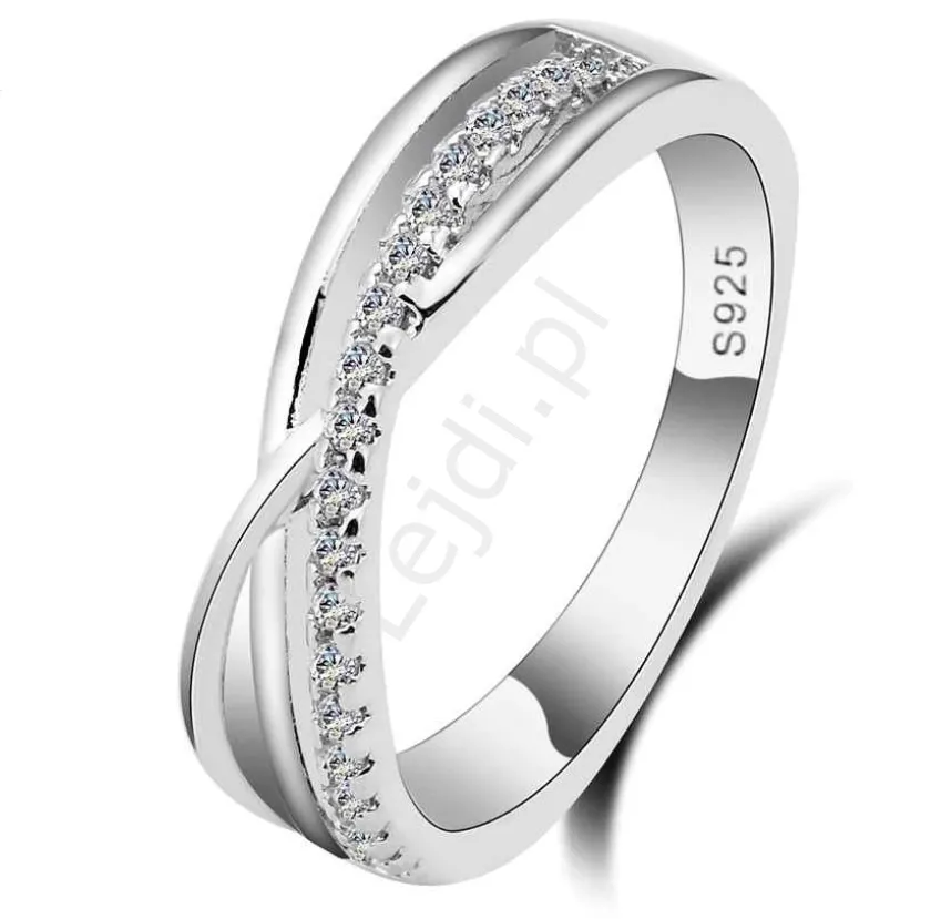 Srebrny pierścionek o eleganckim wzorze, zdobiony cyrkoniami.