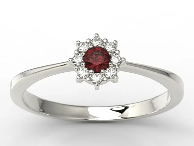 Delikatny blask gładkiej powierzchni białego złota próby 0,585 podkreśla intensywny kolor umiejscowionego w samym centrum rubinu o masie 0,15 ct. Drogocenny klejnot otoczony jest przez osiem skrzących się naturalnym blaskiem diamentów.