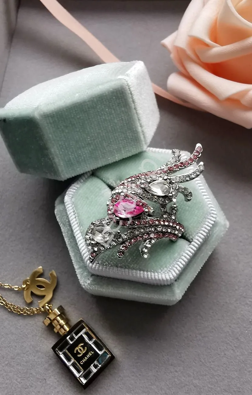 Piękny pierścionek w srebrnym kolorze z różowymi kryształkami. Na pierścionku gałązka z kwiatami z kryształków. Elegancki pierścionek na co dzień. Sprawdzi się również na prezent.