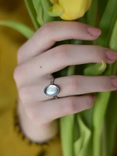 Pierścionek wykonany ręcznie ze srebra z kryształem górskim. Wykończony oksyda w kolorze grafitowym. Wymiary oprawy srebrnej 1,8 cm na 1,5 cm. Pierścionek na regulowanej obrączce. Szerokość szyny 4 mm. Kryształ górski jest kamieniem o najsilniejszym działaniu oczyszczającym , i to zarówno ciało, umysł jaki i pomieszczenia. Nazywany jest również neutralizatorem, solą ziemi i królem kryształów. Kamień ten pochłania niekorzystne wibracje, energetyzuje, leczy, ma właściwości ochronne. Jest tarczą odbijającą negatywną energię. Dedykowany dla następujących znaków zodiaku: Bliźniąt, Raka, Koziorożca.