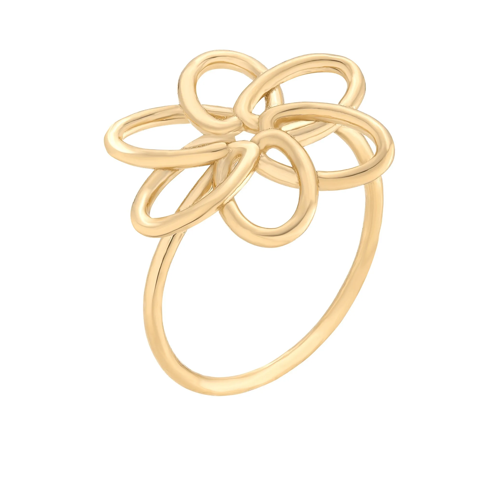 Złoty pierścionek z kwiatkiem wykonany ze srebra 925 powlekanego 24 karatowym różowym złotem. Pierścionek dopasowuje się do rozmiaru palca poprzez delikatne rozginanie lub dociskanie obręczy. Rozmiar uniwersalny Pierścionek został wykonany z drutu giętego o grubości 0,8 mm Kwiatek 17 mm Produkt o wadze poniżej 5 g. Zapakowany w eleganckie pudełeczko z logo marki. Posiada logowana metkę. Istnieje możliwość zamówienia pierścionka ze srebra 925 lub srebra 925 powlekanego 24 karatowym żółtym złotem.