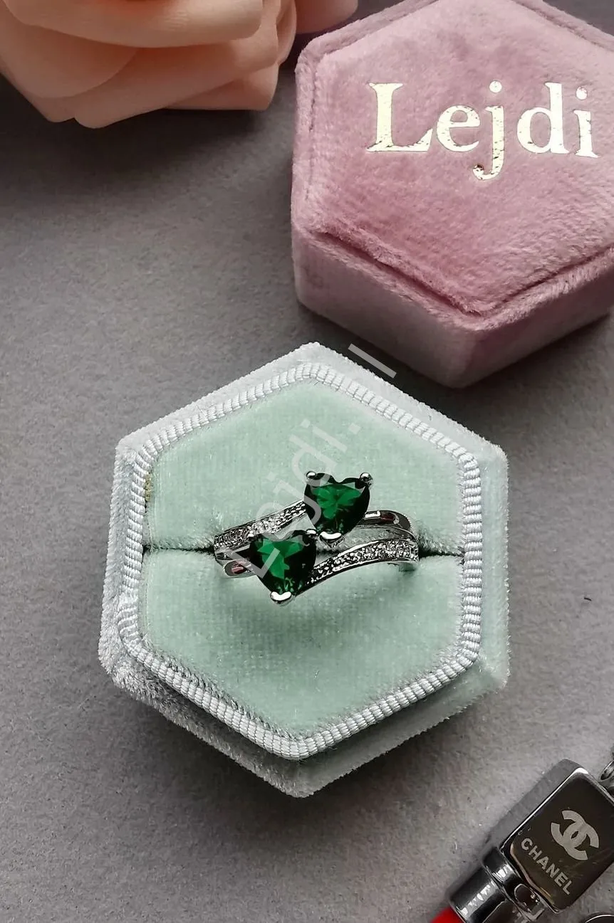 Pierścionek z serduszkami w kolorze szmaragdowym