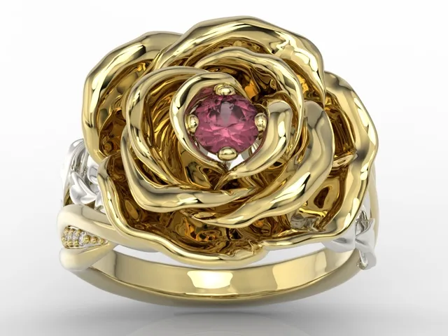 Pierścionek z żółtego i białego złota w kształcie róży z rubinem i cyrkoniami AP-95ZB-C
