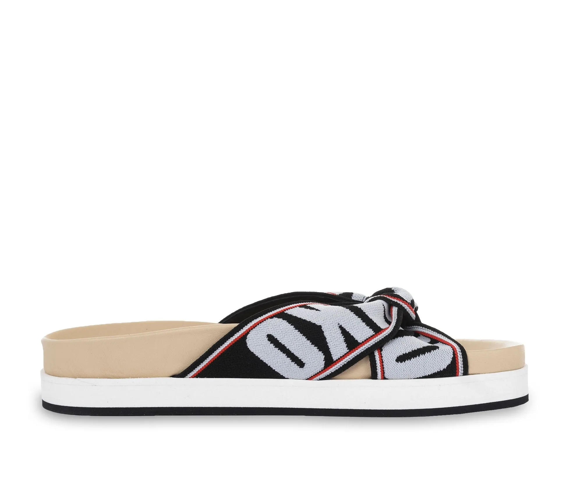 Bestsellerowy model klapek marki Pinko. Wykonane z eleganckiej, plecionej satyny, która dodatkowo ozdobiona została metalowymi łańcuszkami w kolorze srebra. Gumowa, stabilna podeszwa zapewnia komfort podczas chodzenia. Absolutny MUST HAVE zarówno plażowych jak i miejskich stylizacji. Materiał 1: poliester Materiał 2: PVC