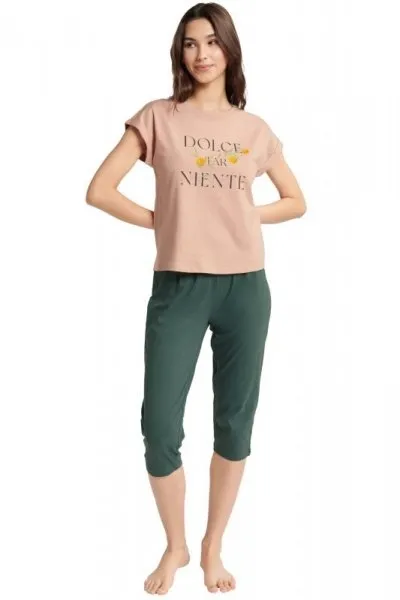 Piżama damska- koszulka z krótkim rękawem- przód zdobi nadruk z napisem LOVE- dekolt okrągły- spodnie typu rybaczki- w pasie gumka obszyta bawełną Skład: 100% bawełna…