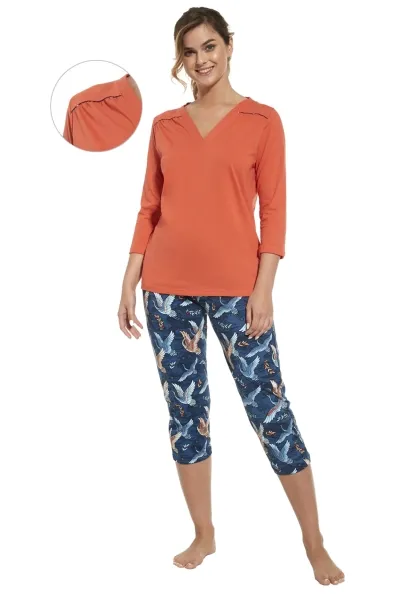 Piżama damska- koszulka z delikatnej bawełny- rękaw 3/4- dekolt w kształcie litery „V”- mankiety i dekolt obszyty lamówką- spodnie typu rybaczki, wzorzyste- w pasie gumka w tuneluSkład: 100% bawełna…