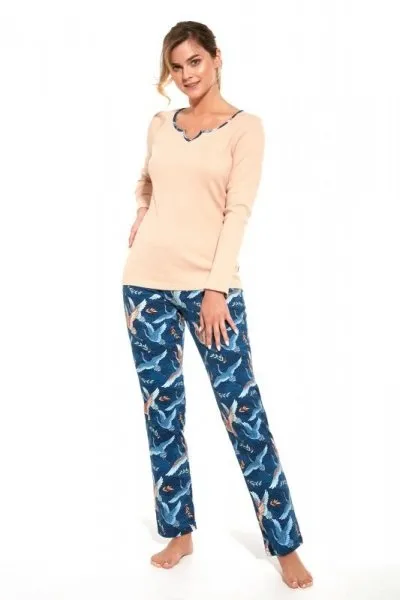 Piżama damska z wysokiej jakości bawełny- koszulka z rękawem 3/4, gładka- ramiona ozdobione lamówką w kontrastującym kolorze- dekolt w kształcie litery „V”- spodnie wzorzyste, długość 7/8Skład: 100% bawełna…