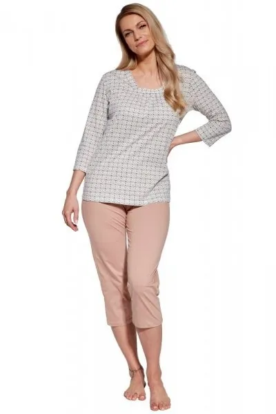 Bawełniana piżama damska- koszulka wzorzysta, z rękawem 3/4- dekolt z delikatnym marszczeniem- spodnie gładkie typu rybaczki- w pasie gumka Skład: 100% bawełna…