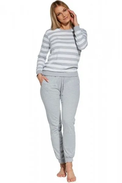 Bawełniana piżama damska- koszulka wzorzysta, z krótkim rękawem- dekolt jednolity w kształcie litery „V”- spodnie granatowe, długość 7/8- w pasie gumka i ozdobna satynowa kokardka Skład: 100% bawełna…